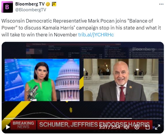 今天在彭博电视台的权力平衡早间版节目中,主持人凯利·莱因兹采访了威斯康星州民主党代表马克·波坎,谈到哈里斯在他的州进行竞选活动以及11月份赢得该州所需的条件。