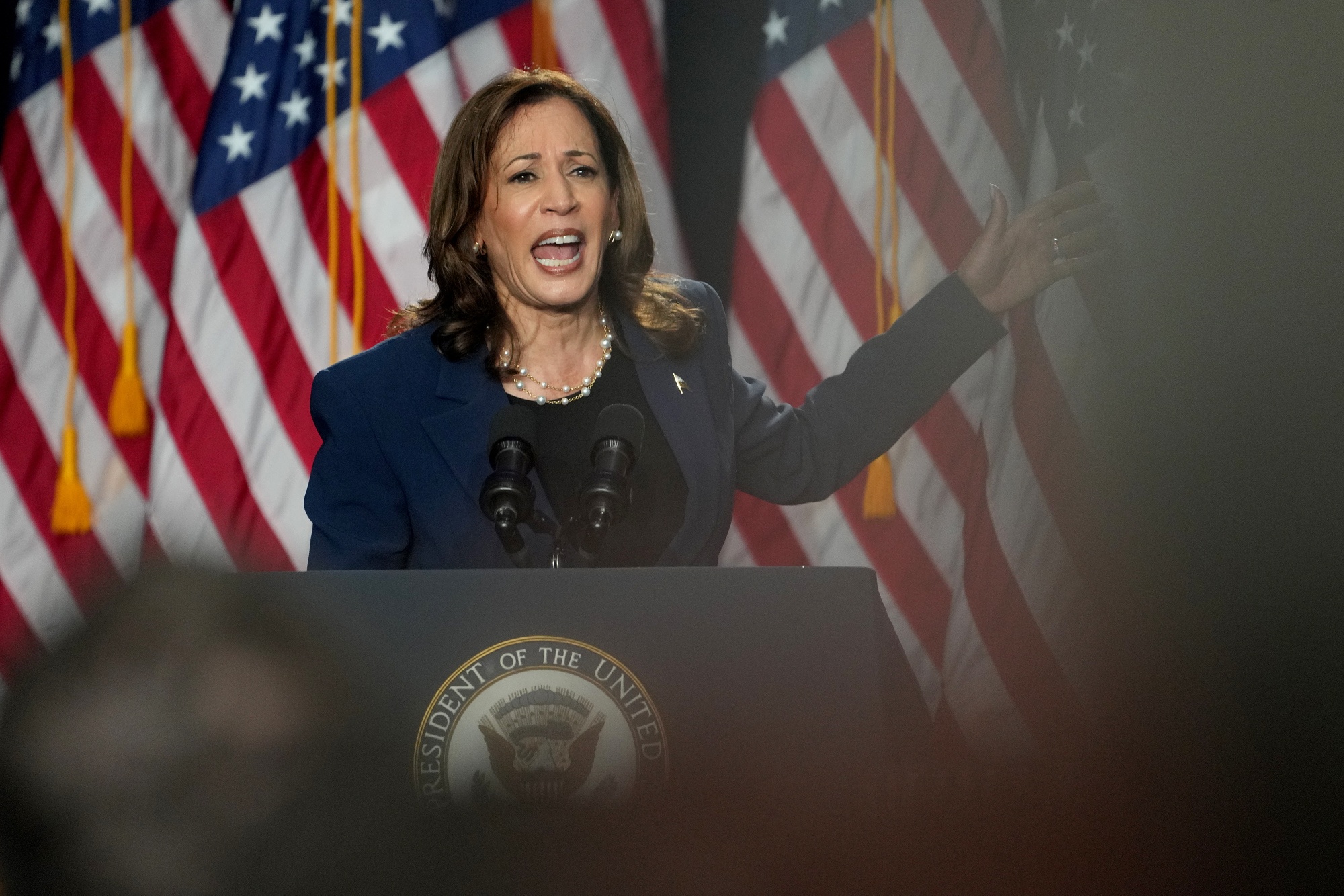 卡玛拉·哈里斯在7月22日在特拉华州威明顿的竞选总部发表讲话。摄影师:Erin Schaff/AFP/Getty Images
