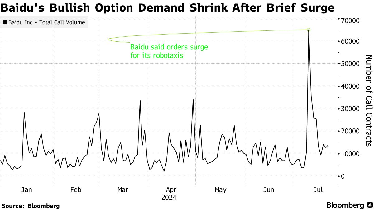目前,下一个催化剂可能会在公司下个月的财报中出现。据彭博社编制的数据显示,预计百度第二季度的营收增长率为1.2%,与三月份的增速相似,这是自2022年以来最慢的增长。在公司宣布在武汉扩张后,看涨期权合约需求出现短暂激增,但交易量迅速下降。