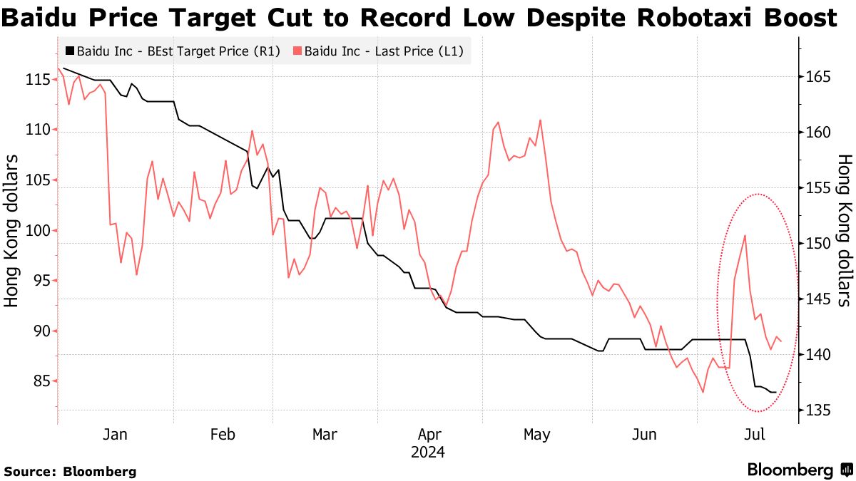 在该公司宣布将在武汉市推出一支由全自动驾驶汽车组成的出租车队后,这家互联网搜索巨头的股价几乎抹去了本月在香港取得的涨幅。现在,随着分析师将其平均12个月目标价下调至历史最低水平,百度的股价可能会延续今年以来的下跌趋势。