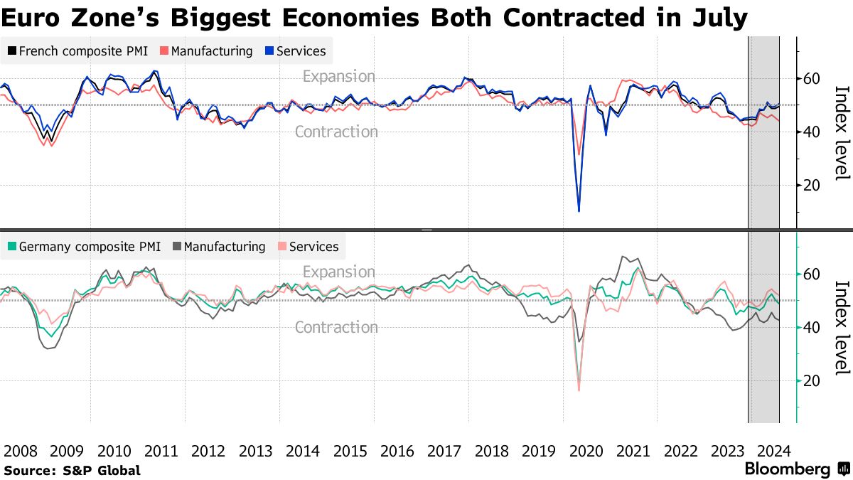 法国经济表现更好,接近于在前两个月的萎缩之后实现稳定。然而,存在显著的分歧。服务业受到本周奥运会的推动,而工厂产出下降。