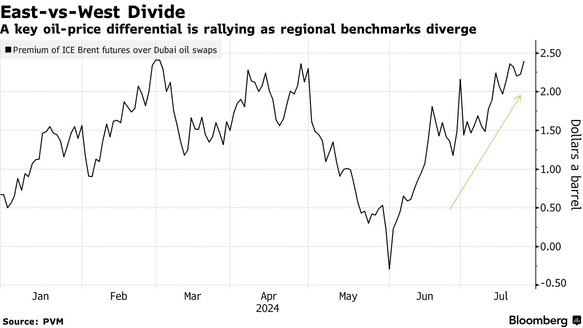 一项备受关注的石油市场指标,即欧洲布伦特原油相对迪拜原油的溢价(称为布伦特-迪拜EFS),最近几天达到了自3月初以来的最高水平,据彭博社编制的数据显示。相关的掉期合同,通常每天波动几美分,过去两周已经上涨了近一美元。