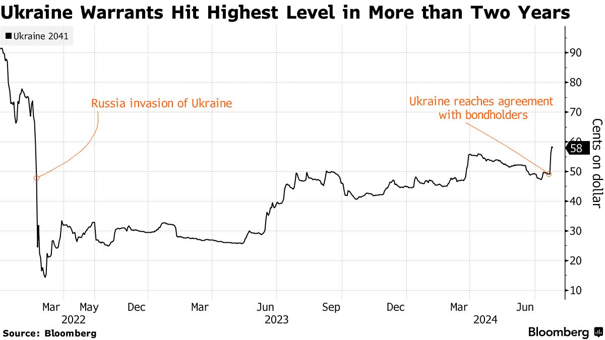 这些到期日为2041年的权证周三以大约每美元58美分的价格交易,接近自2022年俄罗斯全面入侵乌克兰以来的最高水平。在入侵之后,乌克兰国际债券持有人同意暂停债务支付两年,该期限将于下个月到期,以减轻乌克兰在战争期间的一些财务压力。