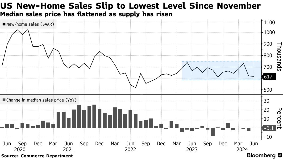 根据周三发布的政府数据,新单户住宅的合同签署速度下降了0.6%,至每年617,000套的速度,这是继五月近15%的下降之后的最大跌幅,也是两年来最大的跌幅。这一数字低于彭博调查的经济学家中除了两个估计之外的所有估计。