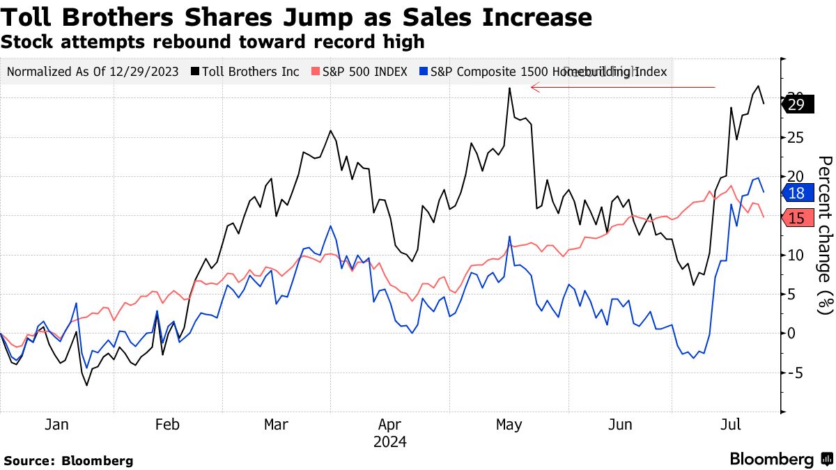 结果是高端房地产市场的繁荣,这推动了股市最大的美国豪华住宅建筑商走向新高。托尔兄弟公司(Toll Brothers Inc.)在5月份的财政第二季度业绩报告中发布了强于预期的订单,并提高了全年交付指导。该公司的股价自2023年初以来上涨了约170%,使其成为S&P Midcap 400指数中涨幅第五大的股票,并使该公司成为过去六个月表现最佳的美国上市建筑商。