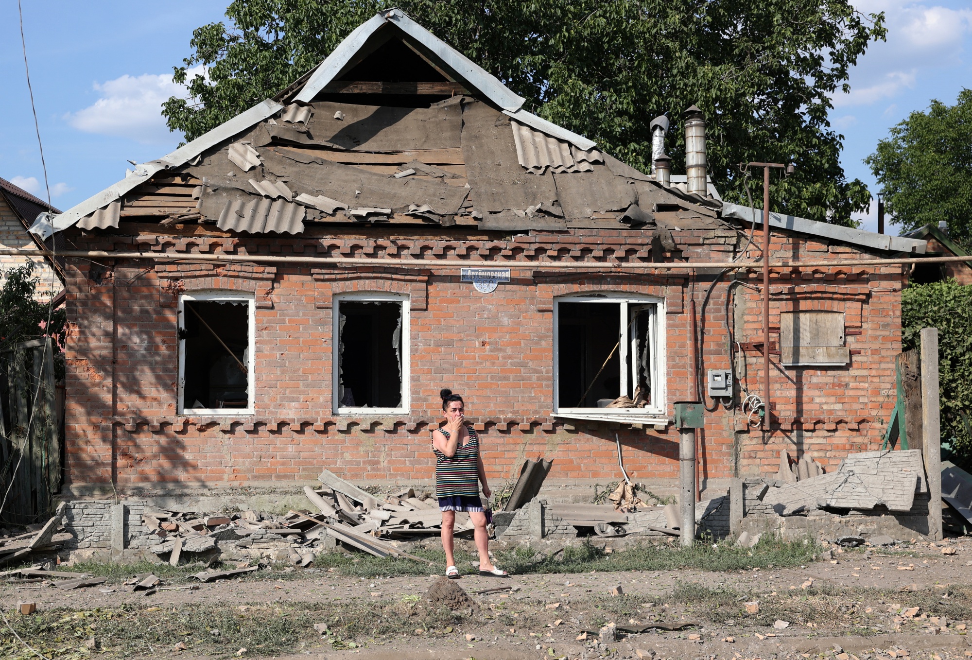 一名居民目睹救援人员在顿涅茨克地区Kostyatynivka镇一所在7月21日导弹袭击中被摧毁的房屋上扑灭火灾。