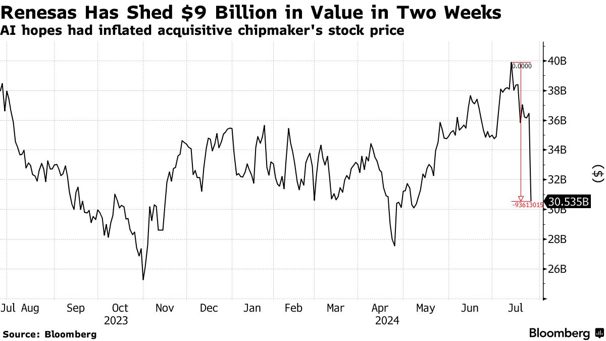 摄影师:SeongJoon Cho/Bloomberg日本芯片制造商瑞萨电子股份有限公司的股价出现了12年来最大的单日跌幅,受到整个科技股抛售和投资者对该公司利润下滑的失望影响。