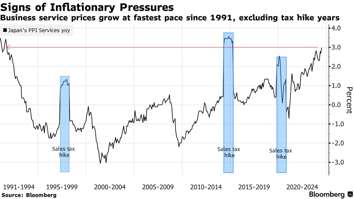 日本企业服务价格上涨幅度创下了大约33年来的最大涨幅,这进一步支持了央行在下周即将召开的政策会议上加息的因素之一。