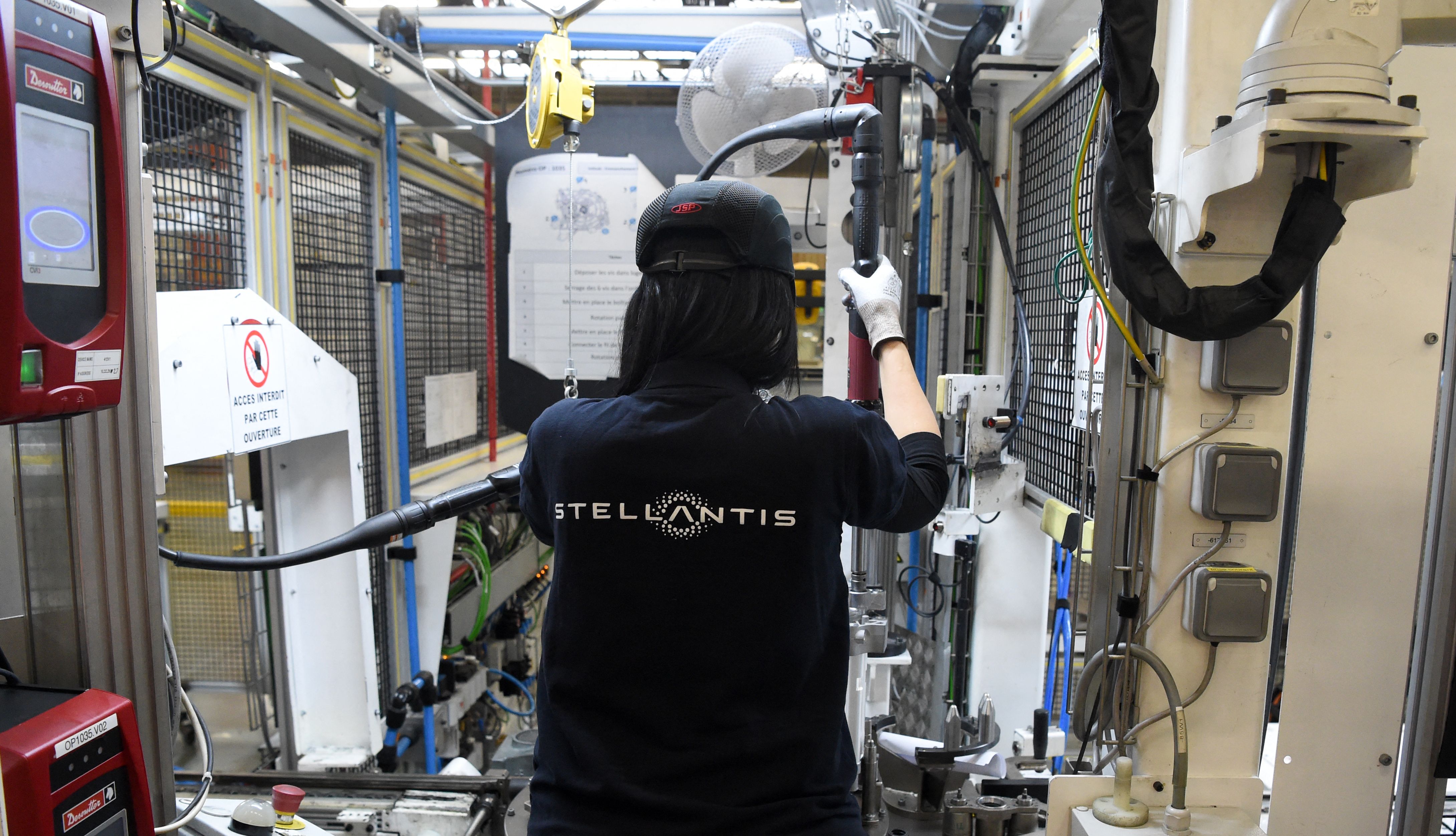 一名员工在法国特雷梅里的斯泰兰蒂斯工厂的电动发动机装配线上工作。摄影师:Eric Piermont/AFP/Getty Images