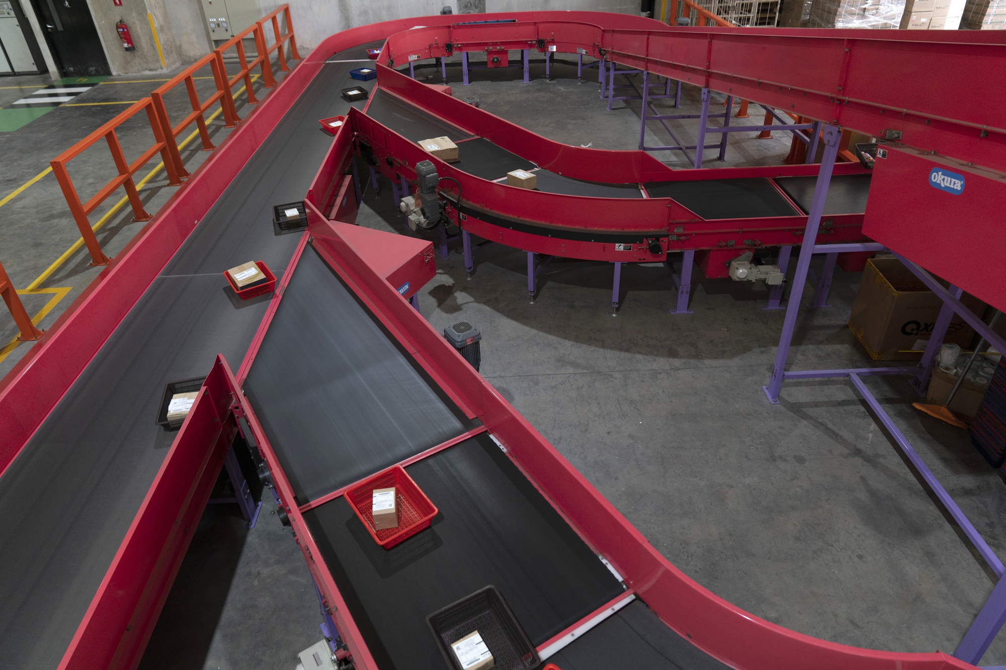 包裹在新加坡Qoo10 Pte.仓库的传送带上移动。