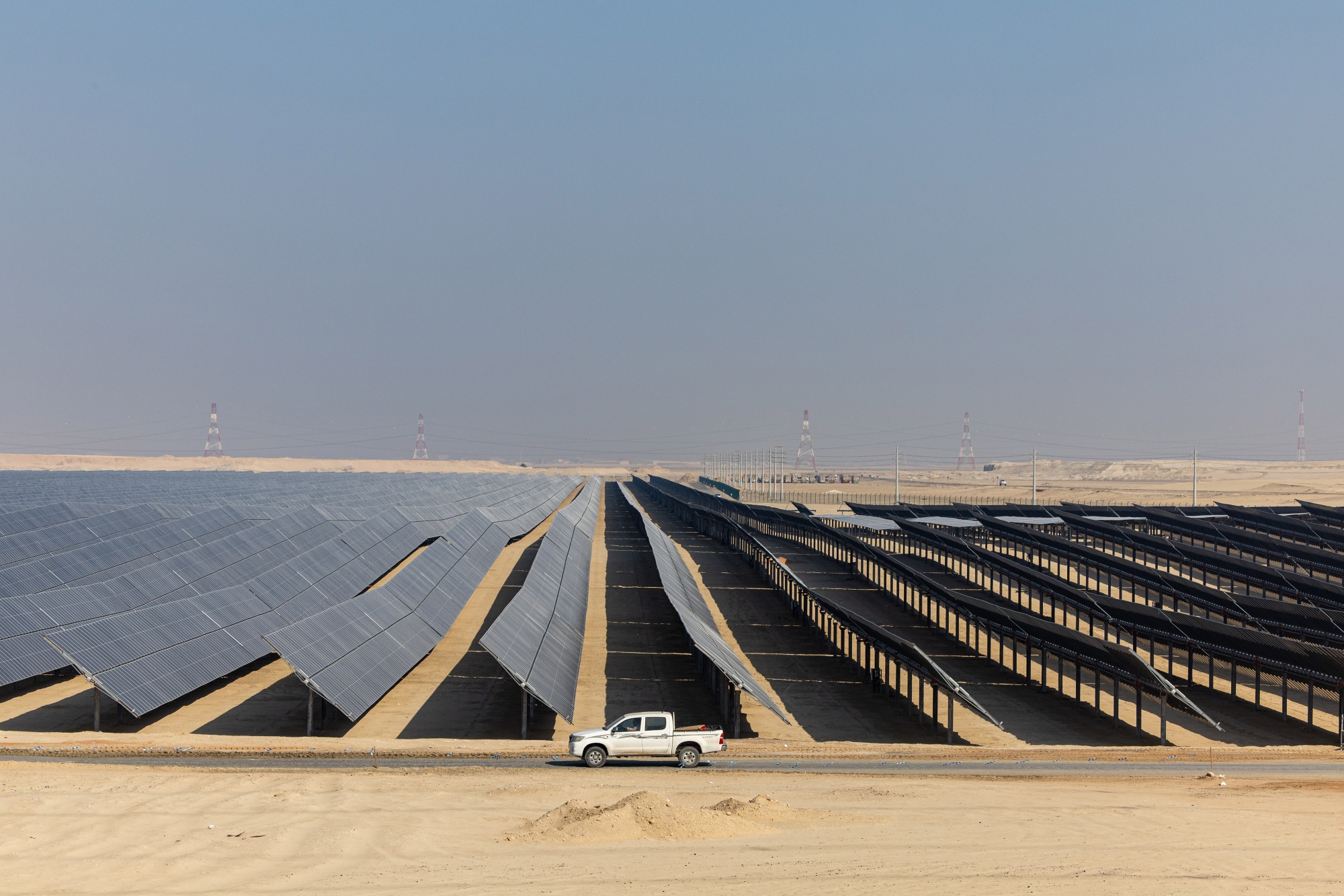 阿联酋的Al Dhafra太阳能项目上的光伏面板,由法国电力公司和中国的金科动力科技有限公司建造。
