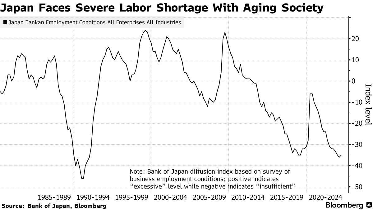 由于日本出生率长期偏低、人口老龄化和严格的移民政策,这个世界第四大经济体的就业紧缺问题十分严重。日本央行最新的Tankan调查显示,短缺问题正在加剧,尤其是在非制造业领域,这些领域正经历30多年来最严重的人力短缺。