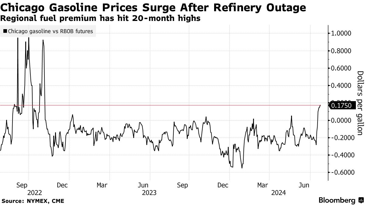 7月15日,一场龙卷风袭击了为朱利埃特工厂供电的输电线路,迫使整个工厂紧急停产。根据General Index的数据,这一事件导致西岸CBOB的价格比汽油期货高出17.5美分,这是自2022年11月以来的最大溢价。