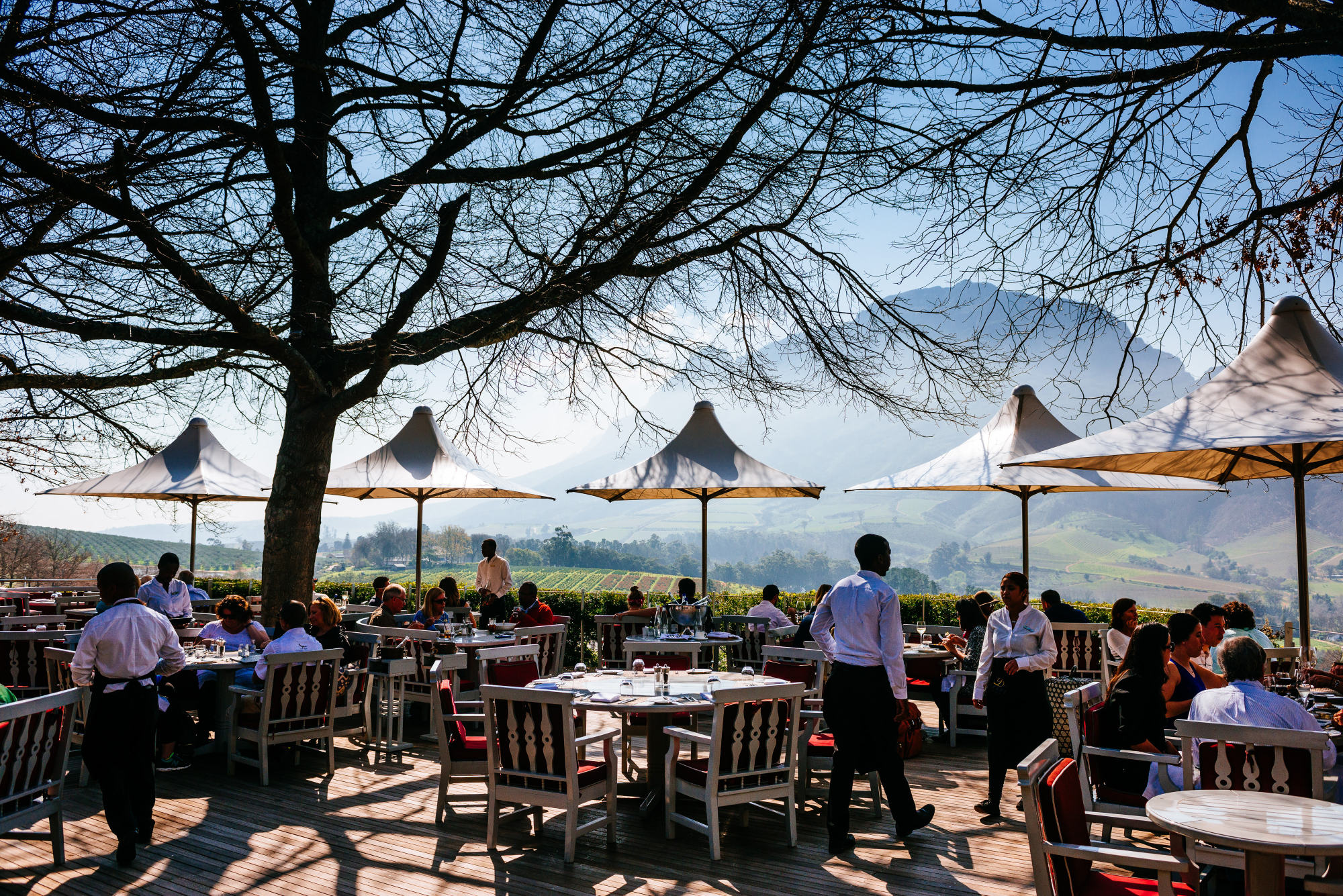南非斯泰伦博斯的Delaire Graff Estate户外餐厅露台。摄影师:Waldo Swiegers/彭博