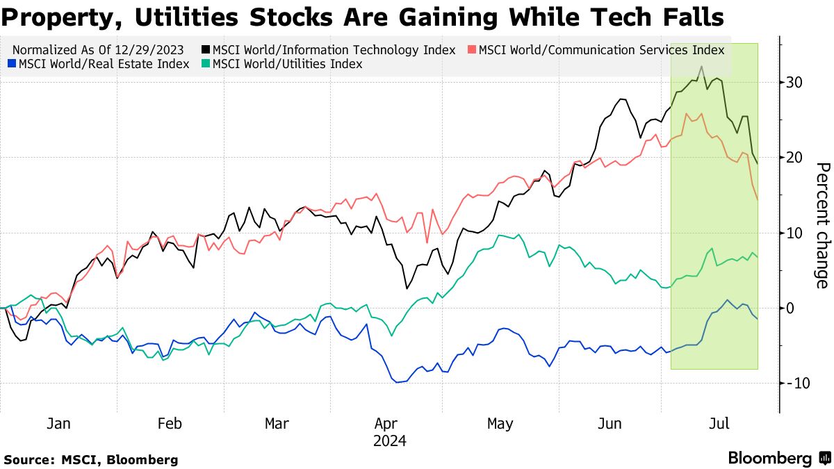 科技和通讯仍然是MSCI世界指数年初至今的前两名表现者,分别上涨了19%和14%,但它们是本季度迄今为止表现最差的两个行业。自6月底以来,涨幅最大的两个行业是房地产和公用事业。