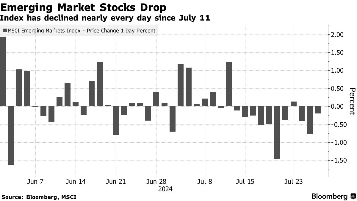 尽管有人押注美联储将在9月降息,但新兴市场指数在周五继续下跌,此前美国数据显示核心个人消费支出在6月以温和的速度上涨,消费保持健康。