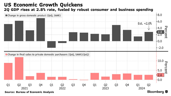 第二季度的国内生产总值增长了2.8%,远超经济学家对2%的中位数预测,并标志着相比今年前三个月的1.4%有所加速。最大的推动因素是个人支出,因为消费者购买了新车和家具。