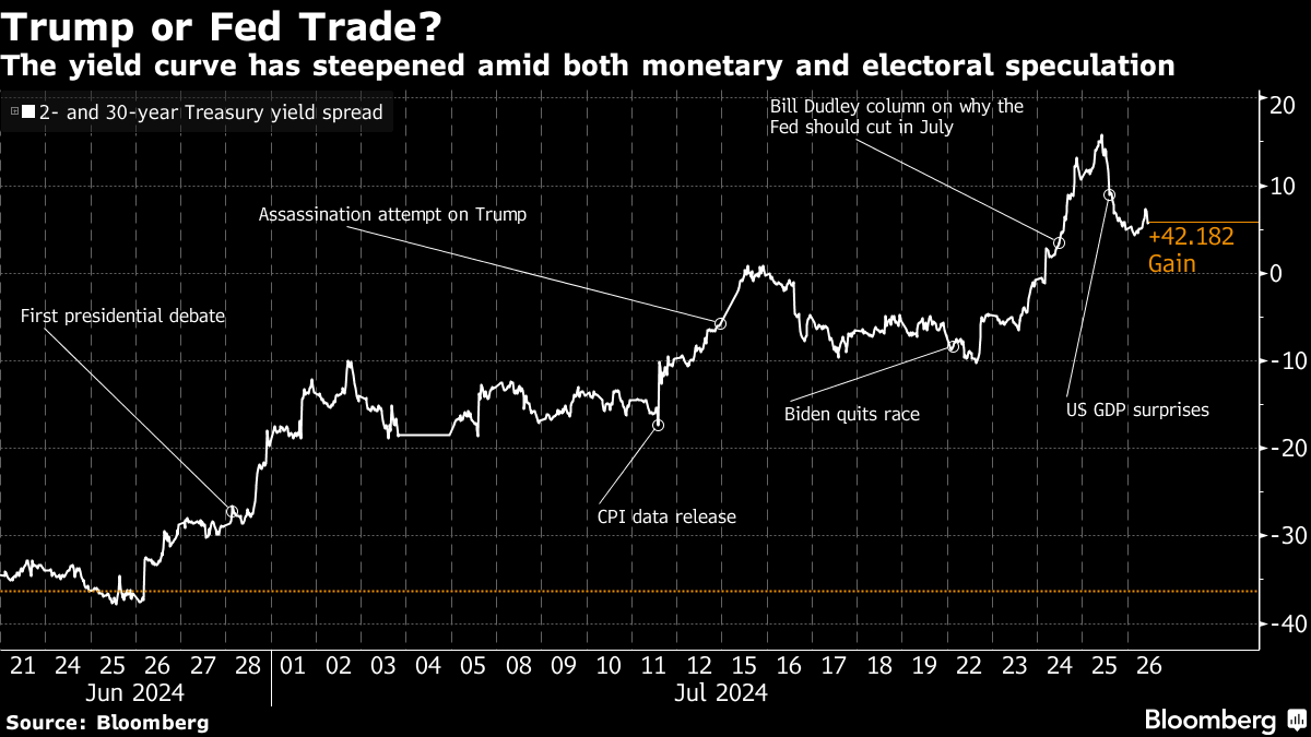 一个例子是美元。特朗普表示希望美元贬值,但共识是他的政策将推高通货膨胀、利率,从而推高美元。另一个例子是债券收益率。根据第一次辩论和对他的暗杀企图后市场的反应,你可以认为曲线陡化交易可能与特朗普的胜算最直接相关。同样,这里的论点是他的减税和财政扩张将推高长端收益率。但阿尔卑斯宏观的陈昭指出,这可能会被更高的关税效应抵消,因为关税实际上是通货紧缩的,因为它们挤压了人们的收入。