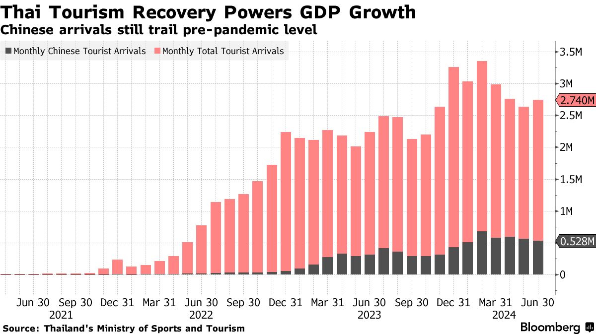 旅游业是泰国的关键产业之一,约占总就业人口的20%,大约占该国5000亿美元经济总量的12%。今年截至7月21日的外国游客到达量比2023年同期增长约34%,达到1960万人次。