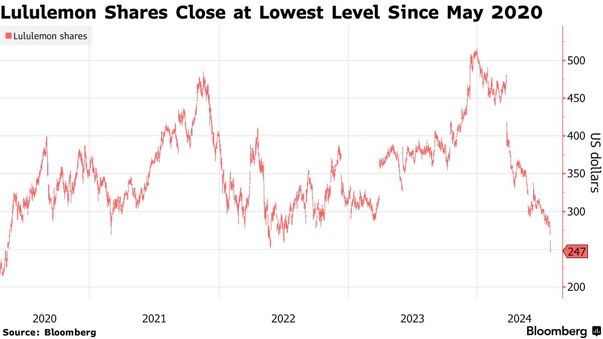 摄影师:Bridget Bennett/BloombergLululemon Athletica Inc.股价下跌至四年来的最低水平,分析师对公司实现财务目标的能力提出新的担忧,原因是持续存在产品执行问题和运动服装趋势放缓。