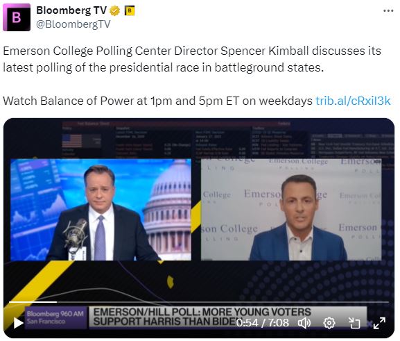 今天在彭博电视台的 权力平衡 早间版节目中,主持人乔·马修采访了埃默森学院民意调查中心主任斯宾塞·金博尔,谈论了他们最新的总统竞选摇摆州的民意调查。