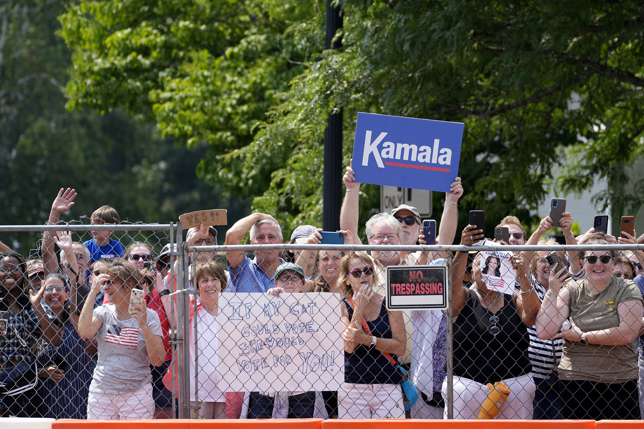 当哈里斯到达时,场外的人们举着标语,上面写着“特朗普很奇怪”和“如果我的猫能投票,她会投你一票。”