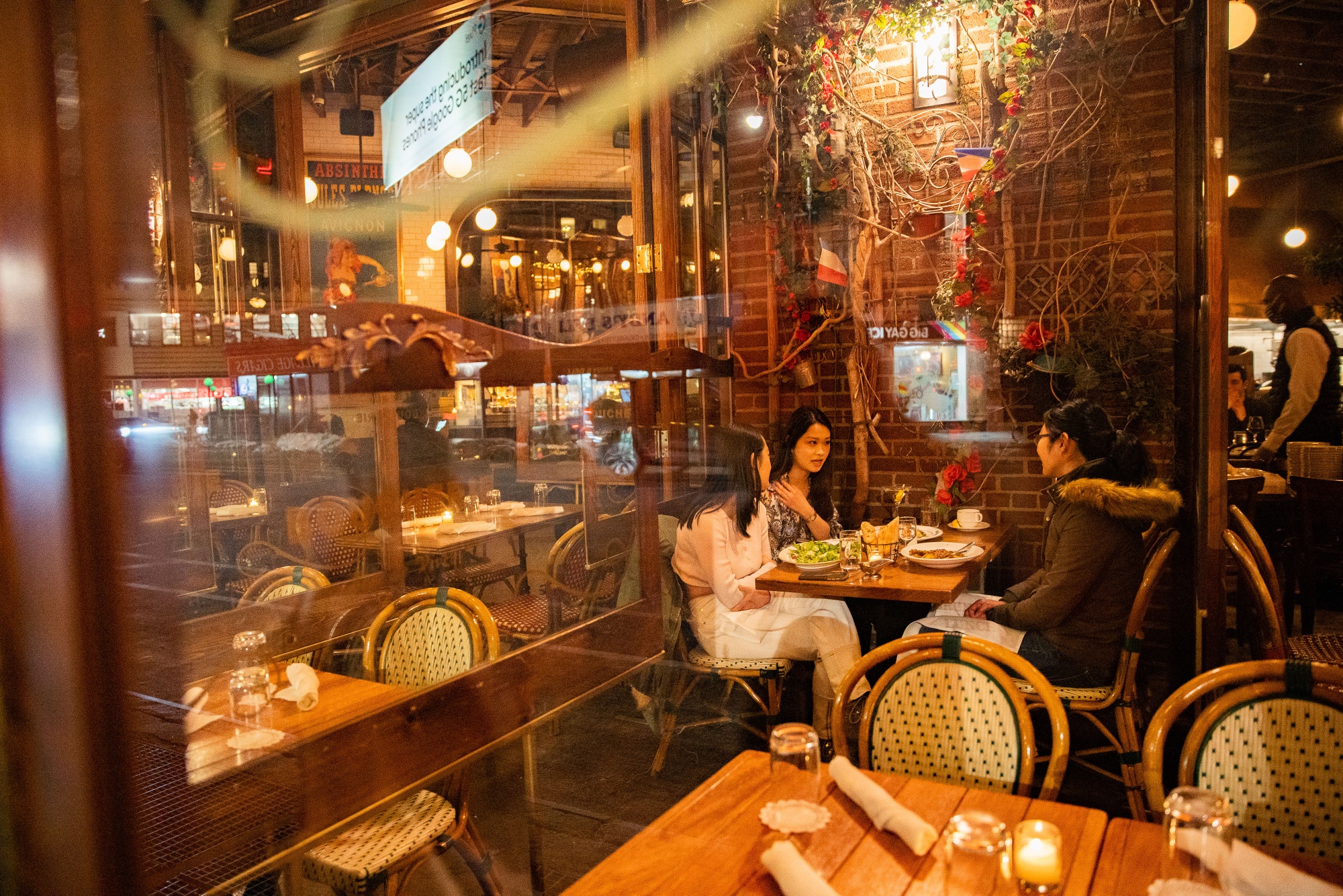 人们在西村的Boucherie餐厅的户外座位区进餐。