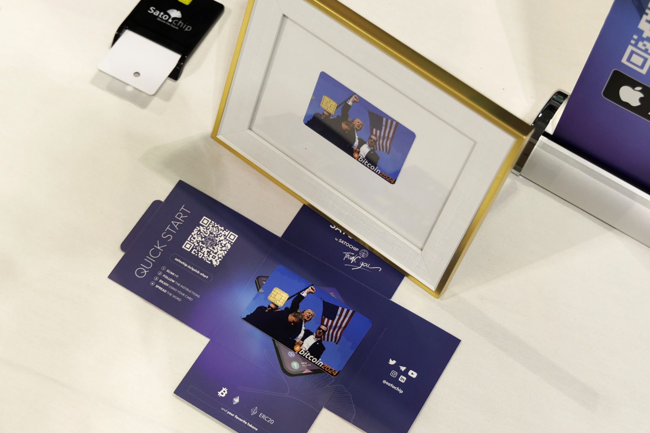 在比特币2024年会议上展示的Satochip加密钱包,展示了特朗普遇刺未遂后拍摄的照片。摄影师:Brett Carlsen/Bloomberg特朗普的加密顾问团队已经扩大,他依赖特斯拉首席执行官埃隆·马斯克这位亿万富翁对这个行业提供建议。他在共和党初选中的前对手、企业家维韦克·拉马斯瓦米也表示,他已经与特朗普讨论了潜在的加密政策。在国会山,他在共和党盟友中找到了一些加密信徒。田纳西州参议员比尔·哈格蒂参加了6月的马阿拉戈会议和纳什维尔比特币会议,成为了特朗普在加密问题上的竞选代言人。