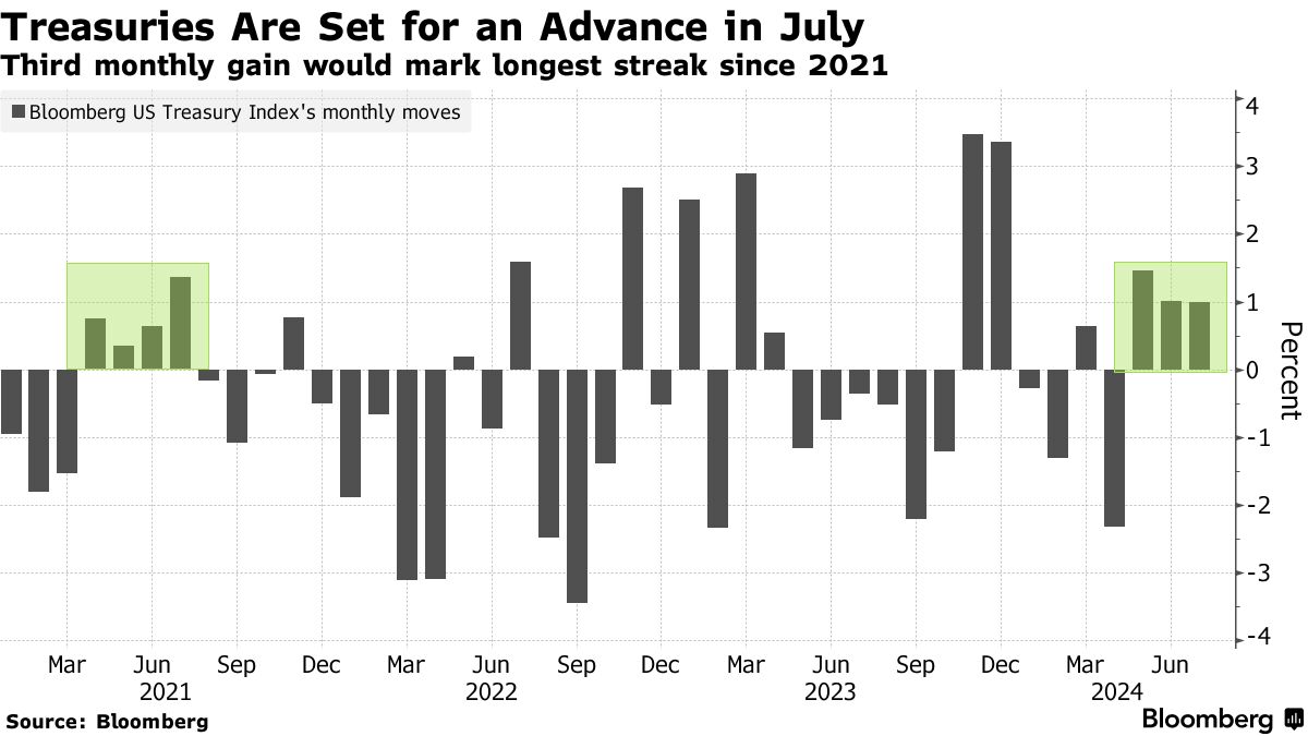 国债正以2021年中期以来最后一次出现的三个月连胜的步伐结束七月。对降息前景的增强信心帮助彭博的美国政府债券指数本月触及两年高点。两年期收益率下降,因为市场预期货币政策将更加宽松,导致与10年期国债之间的利差缩小。