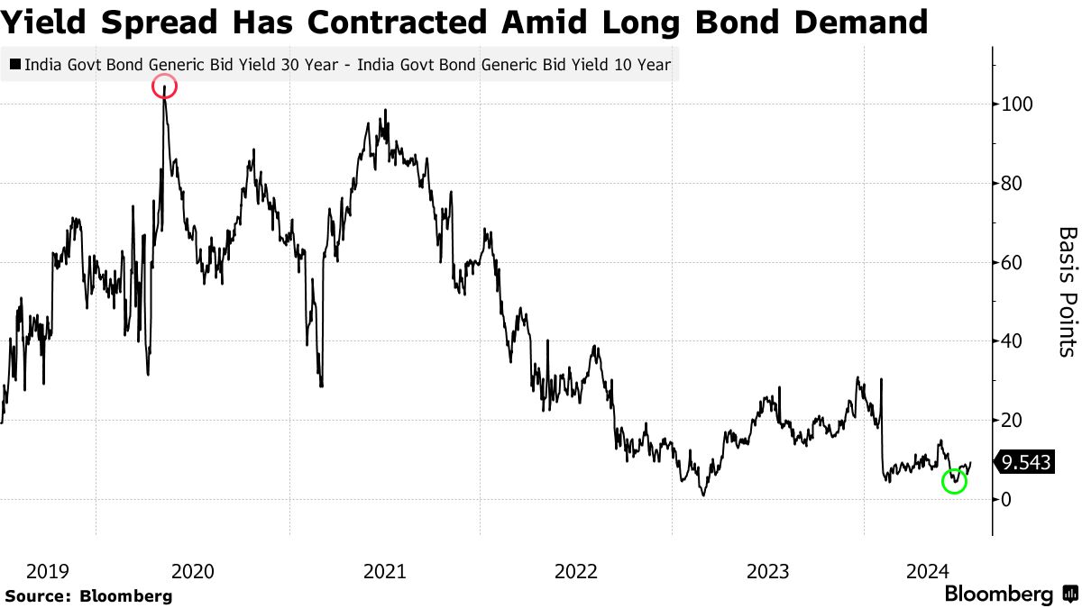 传统上持有较短期债券的外国投资者自指数纳入以来一直在购买较长期限的债券。根据印度结算公司的数据,过去一个月,10年或更长期限的债券在他们持有的完全可访问路线(FAR)债券中占23.5%,这一计算结果由彭博社进行。这比上个月增加了1.7个百分点。