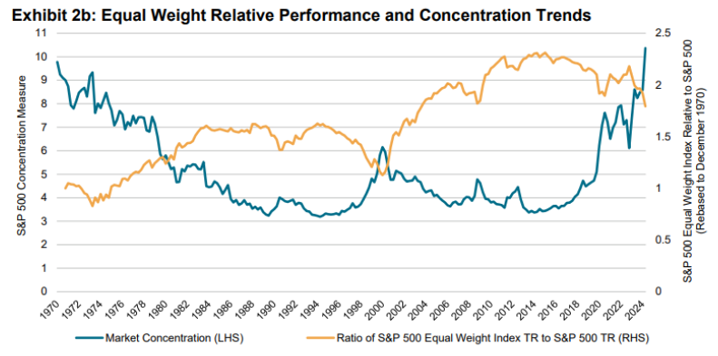 其次,等权重指数最近的严重表现不佳与市场极端集中有关。 这就是等权重相对于主要指数的表现,与标准普尔的市场集中指数相比,后者自1970年以来处于最高水平,两者之间的关系几乎完全相反: