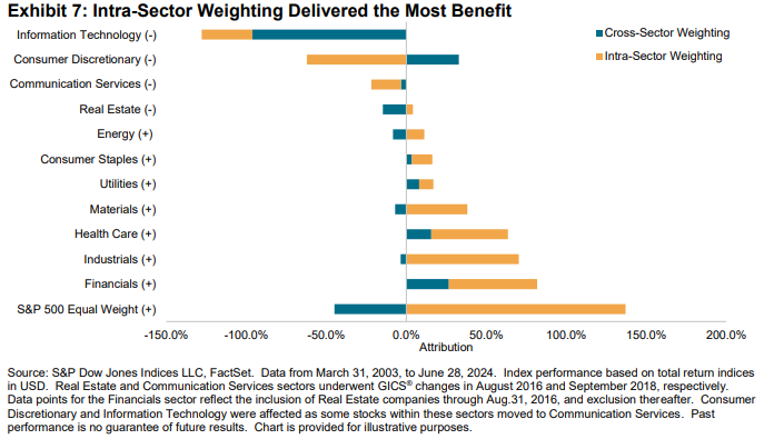 这种超越表现是从哪里来的? 令人惊讶的是,这并不特别是因为较小公司的表现优异。 也不是因为这两个指数往往具有非常不同的行业权重。 信息技术目前占等权重的13.4%,而占市值加权的32.4%,但随着时间的推移,等权重的表现优异来自于在各个行业内选择表现更强劲的股票,而不是行业权重本身。 在过去的20年中,避免过度价值股并在任何给定行业中更多地投入更便宜的股票的等权重纪律一直是成功的秘诀: