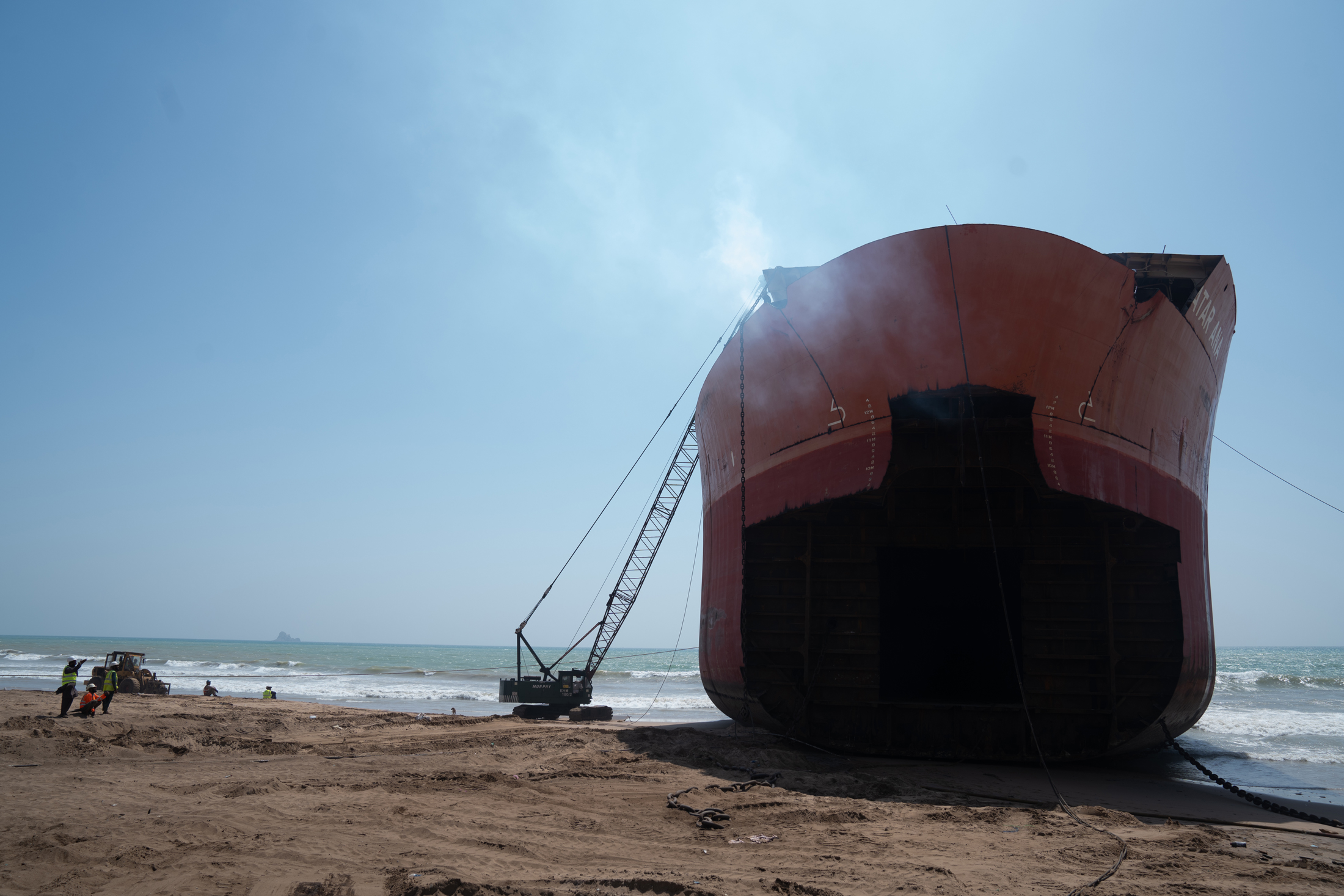 这个约有10,000人口的小镇更像是一个船只的坟场,而不是一个港口,只是一个混乱的10公里(6.2英里)长的油污沾染的海滩。这是南亚三个拆船场之一,数十家小公司在这里拆解全球每年被拆解的几乎四分之三的船只——包括数百艘集装箱船、油轮、汽车运输船、拖船、游轮,甚至石油和天然气平台。这三个拆船场都有相对深的水域,直通海滩,使操作人员能够让巨大的船只搁浅,无需码头。