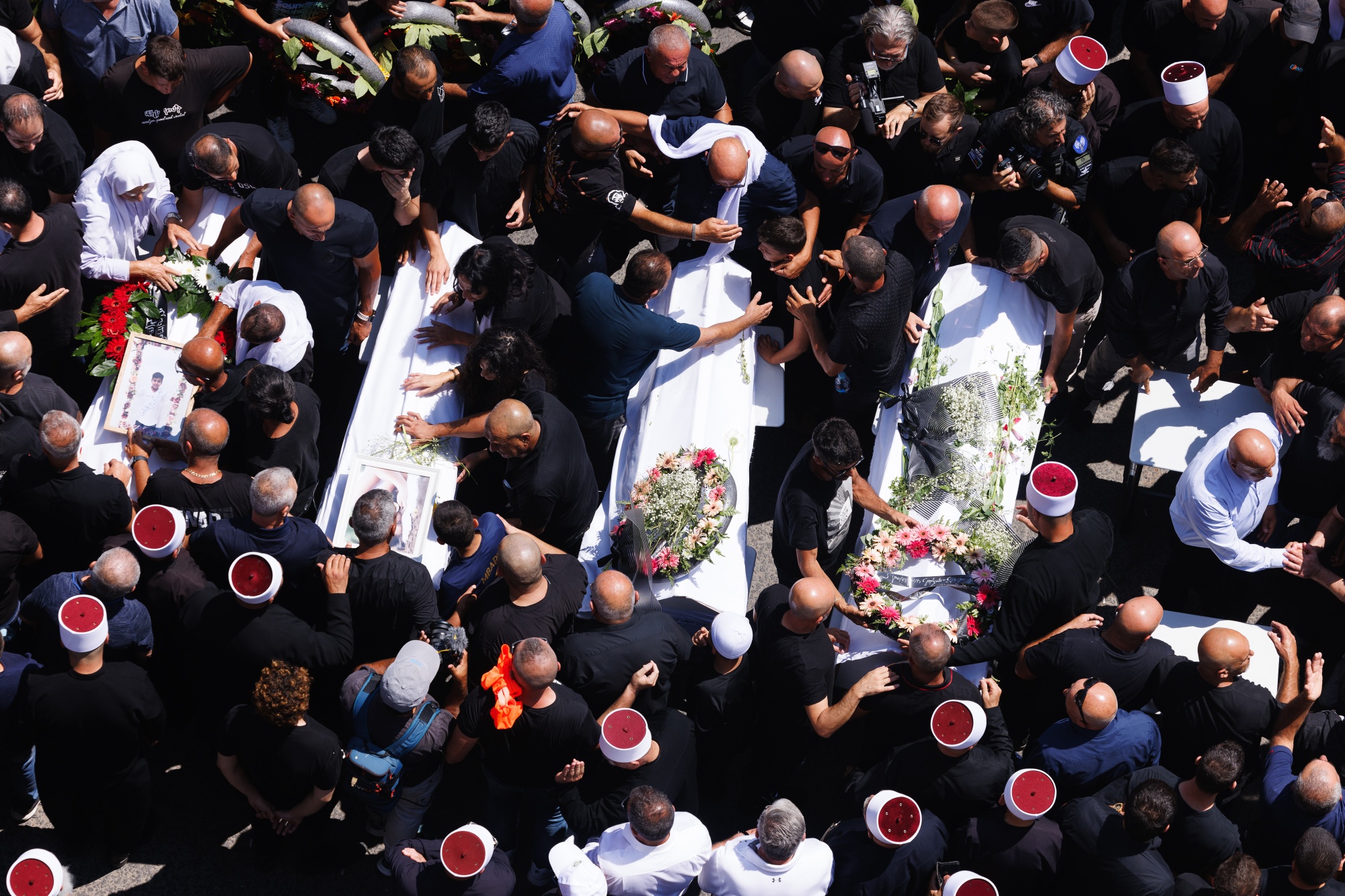 在7月28日马杰达尔沙姆斯遭火箭袭击身亡者的葬礼上的哀悼者。摄影师:Kobi Wolf/Bloomberg### 美国敦促保持冷静