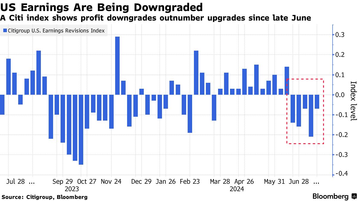 花旗集团的一篮子显示,自6月下旬以来,盈利下调明显多于上调。与此同时,标普500指数中的周期性股票自4月以来表现不佳,相对较安全的防御性行业表现更好。