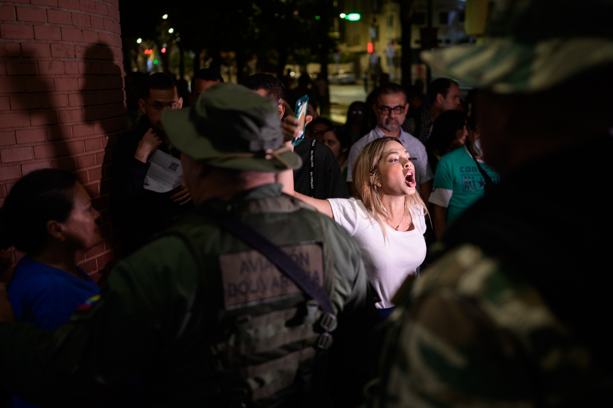 一个民意调查主管昨天在加拉加斯呼喊玻利瓦尔国民警卫队允许进入一个投票站。摄影师:Gaby Oraa/Bloomberg### 全球必读