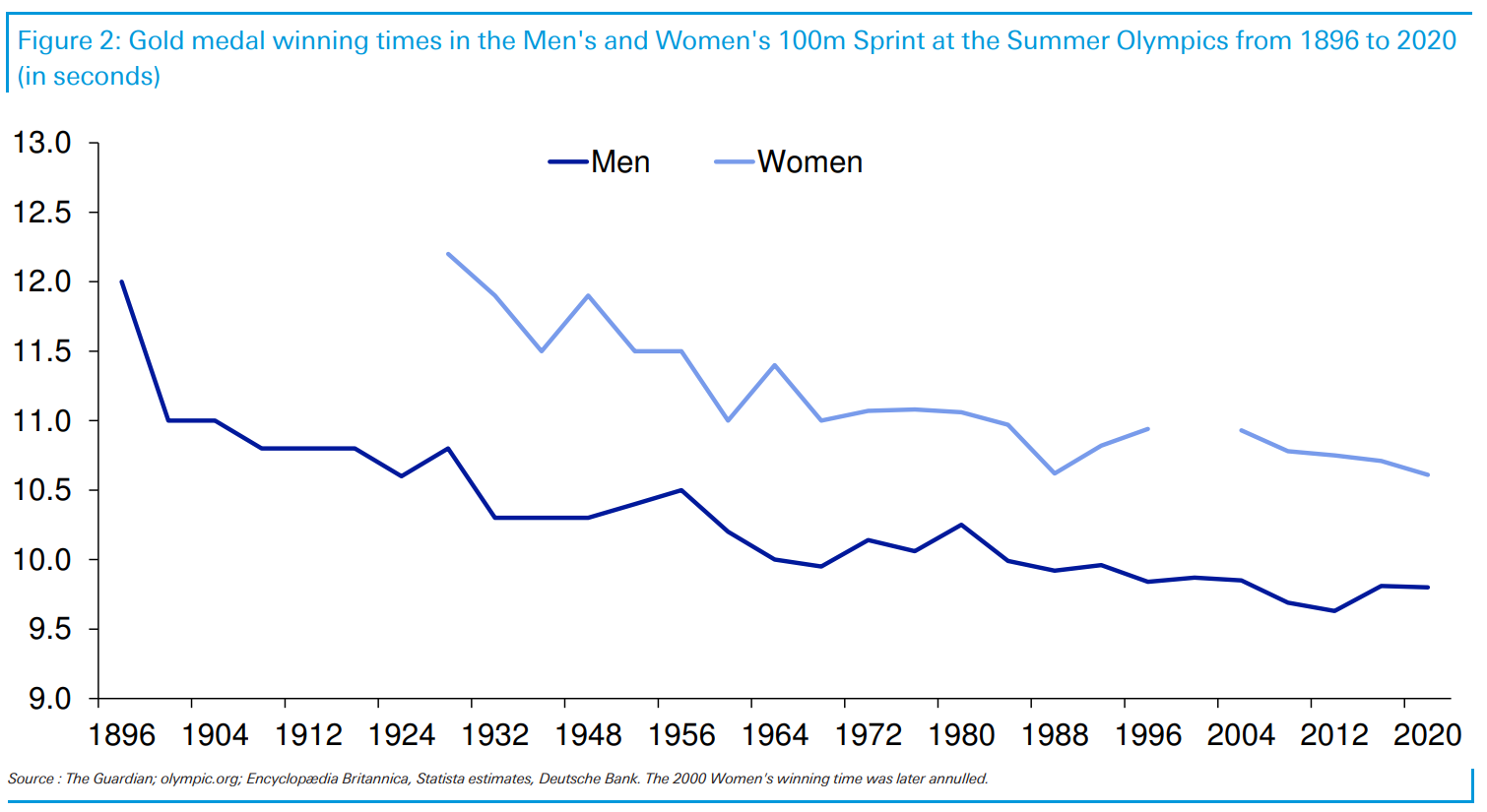自现代奥运会始于1896年以来,经典短跑的获胜时间在最初几十年内稳步下降,但进一步的进展规模较小,里德在周五的一份备忘录中强调。