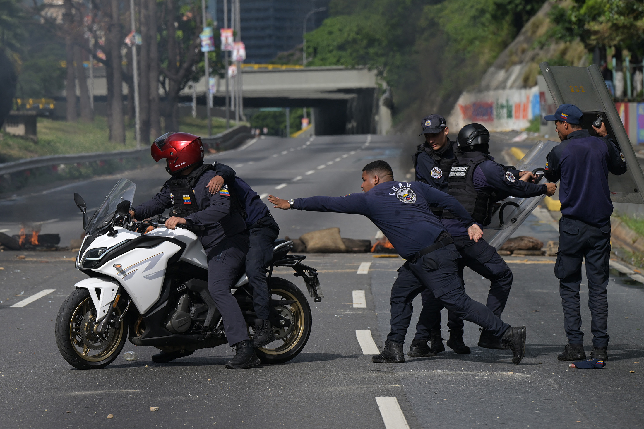 警察在星期一的冲突中帮助一名受伤同事。摄影师:尤里·科尔特斯/法新社/盖蒂图片社参与暴力行为,”冈萨雷斯说。“我们呼吁和解,呼吁和平。”