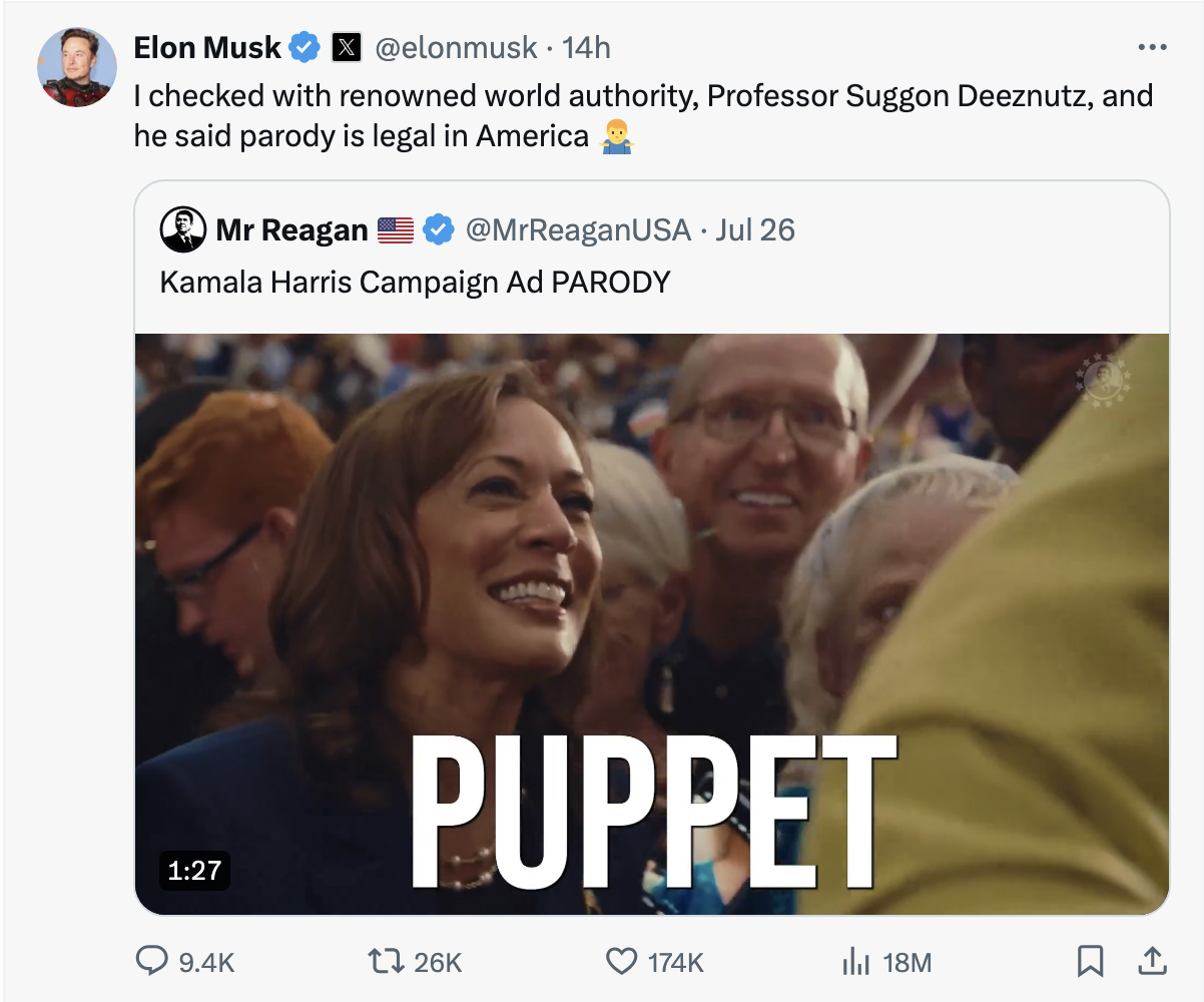 另一方面,埃隆·马斯克分享了一个深度伪造的“竞选广告”,周五晚上,在那里哈里斯的篡改配音声称她是“终极多元化聘用”,不懂“如何经营这个国家的第一件事。” 尽管X禁止用户发布“欺骗性修改”的内容,帕米·奥尔森说服务条款显然不适用于公司所有者。