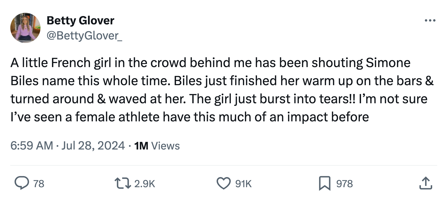 Lisa Jarvis 特别激动,因为 巴尔斯回来了 穿着一件紧身衣。“这位27岁的运动员(总统自由勋章获得者)展现出了一种新的心理坚韧,给我们所有人带来了教训,” Lisa 写道。“她的坦诚正在帮助重新定义什么是韧性。吞下自己的恶魔而不是面对它们会付出巨大的个人代价。巴尔斯向我们展示了一个人可以通过它们并更加坚强和快乐地走出困境。我想说,这不仅仅是给一代有抱负的体操运动员树立了一个很好的榜样,也是给我们所有人尽力应对困境的人树立了一个很好的榜样。”
