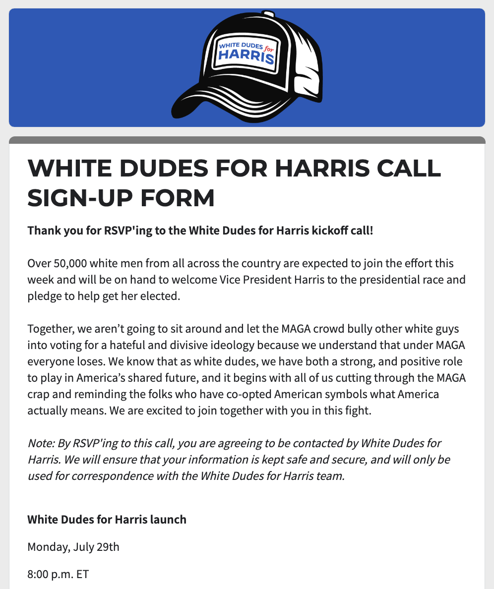 父权制度出现了一些奇怪的现象。一方面,超过80,000名白人男性显然计划今晚加入一个电话会议,支持副总统卡玛拉·哈里斯对抗“奇怪”共和党人。这里有一个官方的谷歌表格,还有一个卡车司机帽图标: