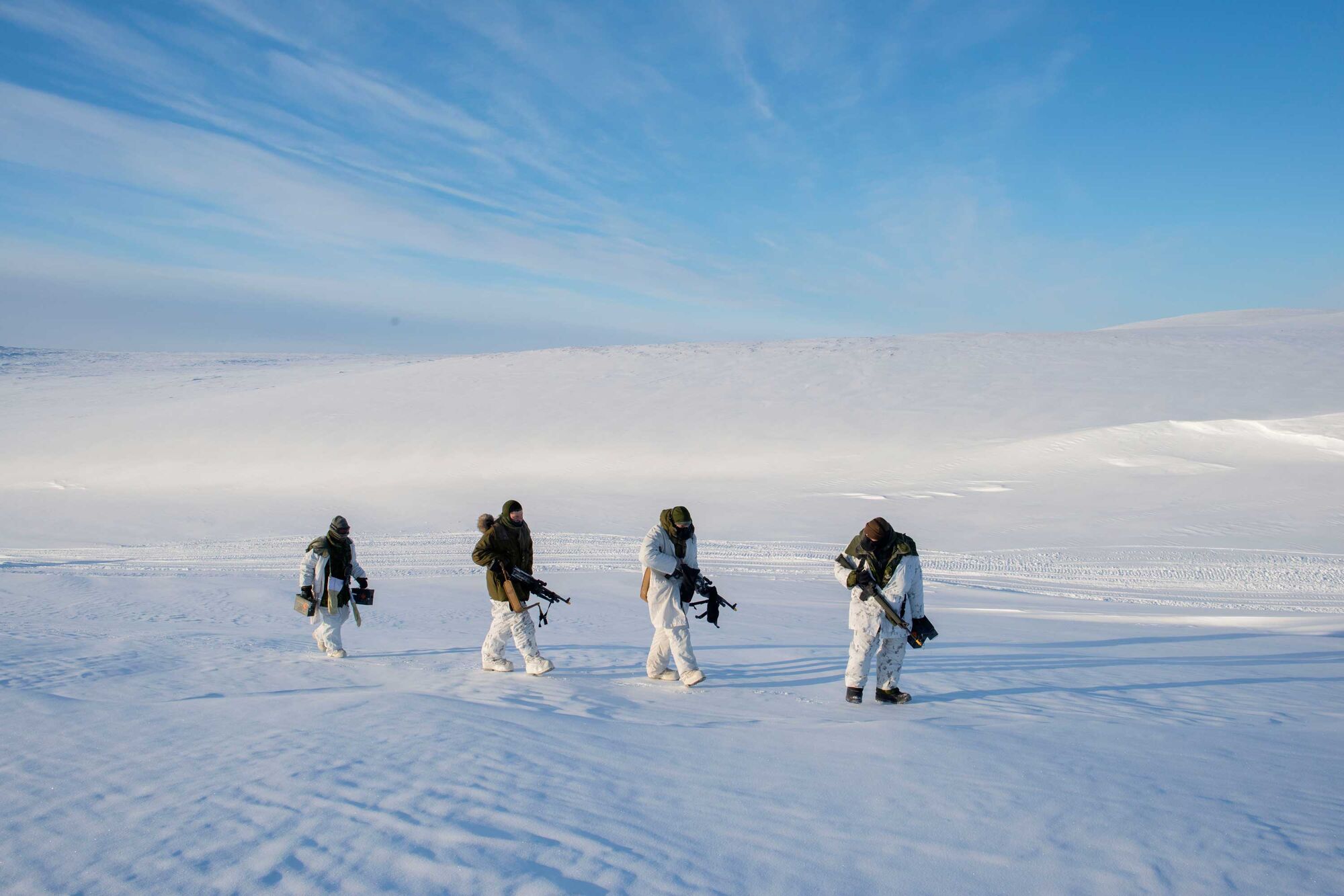 加拿大士兵在2024年3月在努纳武特的Resolute Bay附近进行战斗演习。摄影师:Louie Palu/Agence VU### 更多阅读