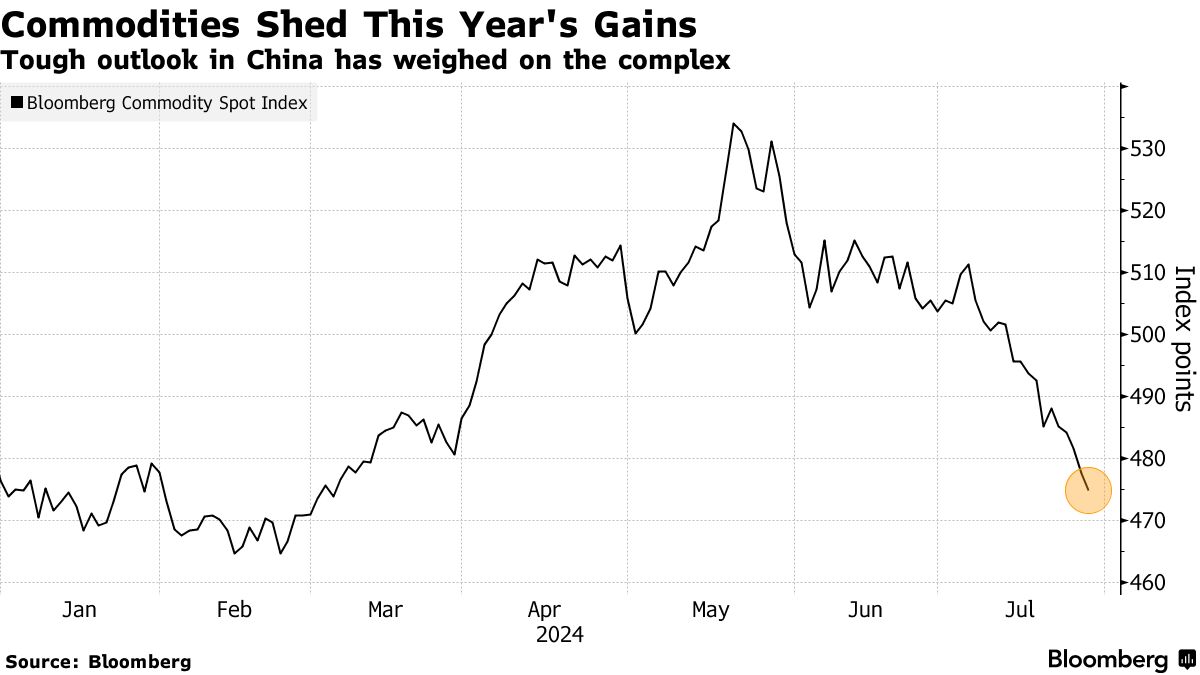 彭博商品现货指数——跟踪一系列能源产品、金属和农产品——7月迄今已经暴跌近6%,使其成为自2023年5月以来表现最糟糕的一个月。