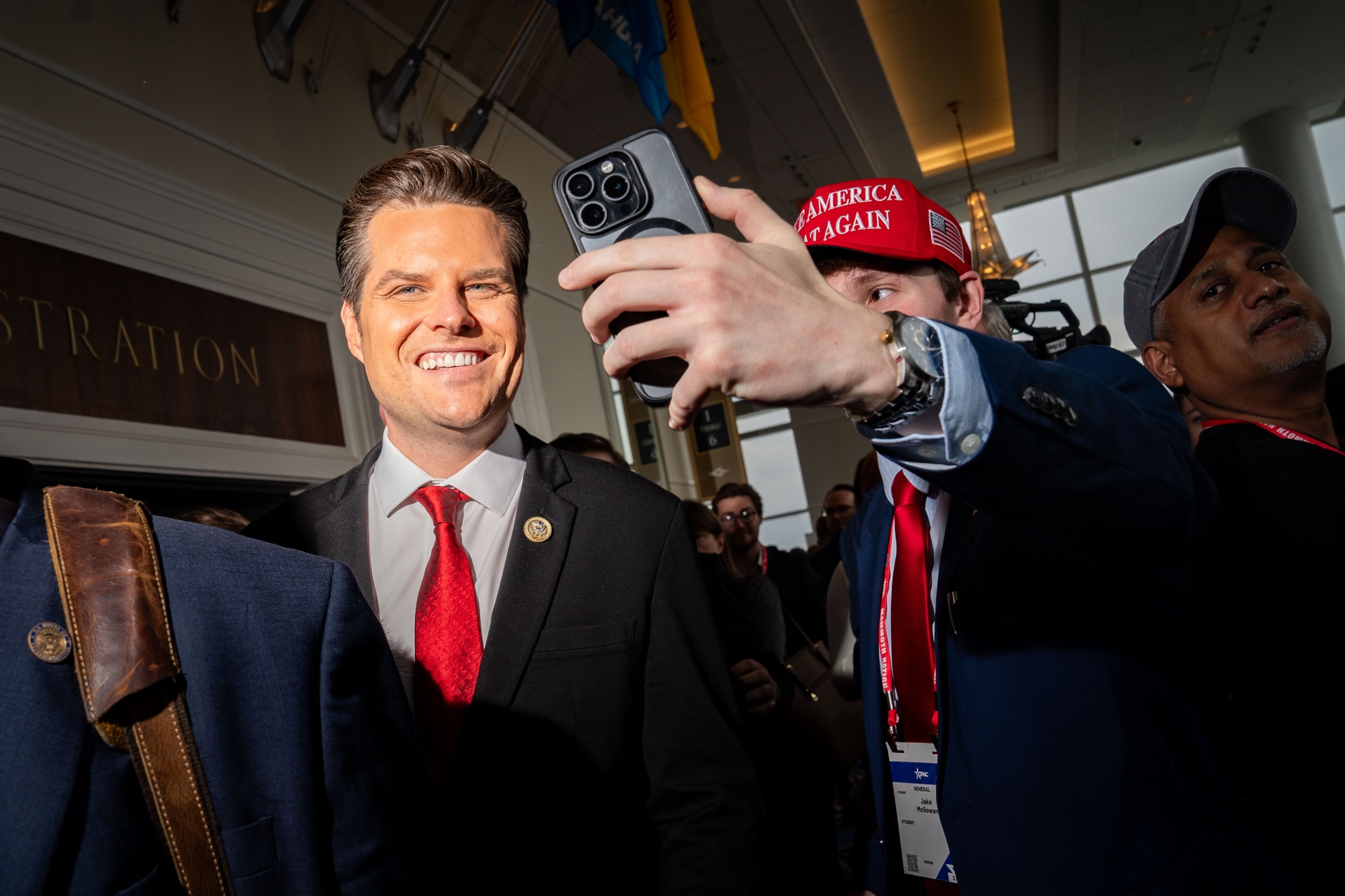 2024年2月23日,美国马里兰州举行的保守政治行动大会(CPAC)上,代表马特·盖茨向与会者致意。摄影师:肯特·西村拉/彭博社弗吉尼亚州的鲍勃·古德是众议院自由派联盟的成员,反对麦卡锡,上个月以不到400票的差距输给了特朗普支持的对手、前海豹突击队员约翰·麦奎尔。本周将进行重新计票。