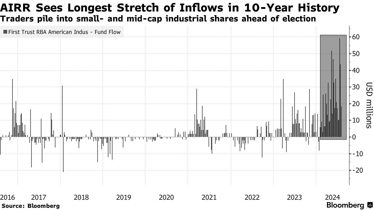 虽然在美国9.5万亿美元的ETF宇宙中,AIRR和RSHO规模很小,但每个基金的资金流入也可能表明一些投资者预计,无论下一任总统是谁,重新回流和工业股都将是赢家。
