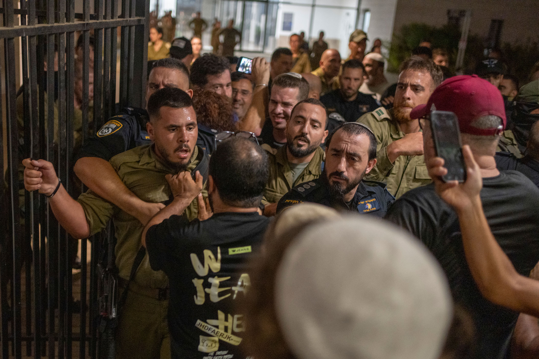 士兵和警察在以色列的贝特利德军事基地与抗议者发生冲突,时间是7月29日。