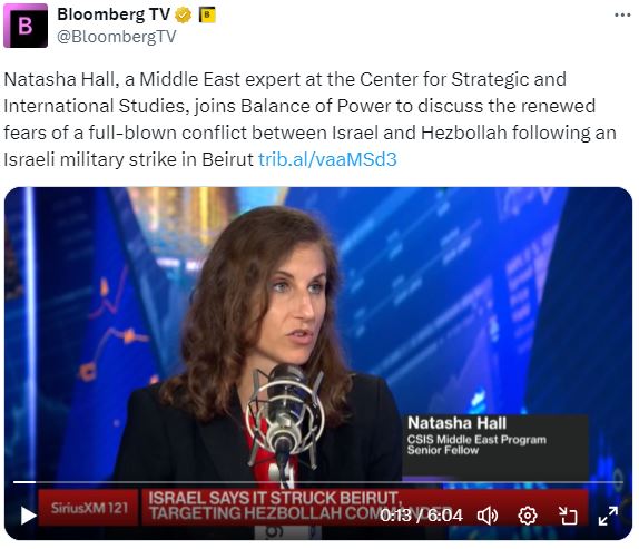 今天在彭博电视台的权力平衡早间版节目中,主持人乔·马修和凯莉·莱因兹采访了中东问题专家纳塔莎·霍尔,她在战略与国际研究中心工作,谈到以色列对贝鲁特的军事打击后,人们重新担心以色列和真主党之间爆发全面冲突。