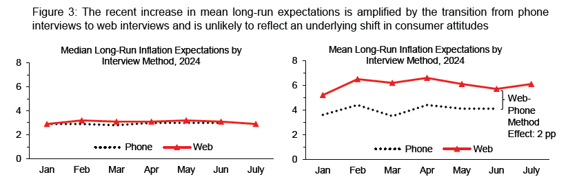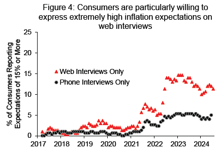 此外,当观察过去七年中愿意预测通货膨胀率达到15%或更高的比例时,我们发现在疫情之后,两种形式中这样极端的预测都有所增加 — 但在网络访谈中激增的方式却没有在电话访谈中得到匹配: