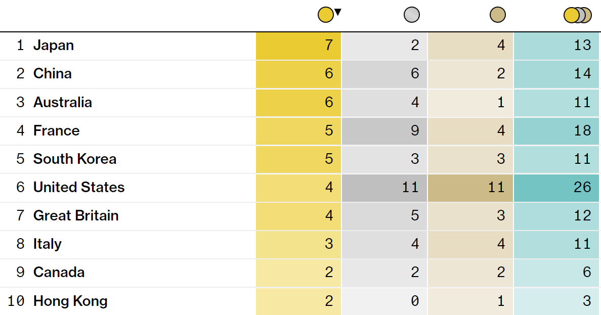 **奥运会:**日本保持了金牌榜首的位置。西蒙·拜尔斯现在是美国最多奖牌的体操运动员,来自三届不同的比赛共获得了八枚奖牌。随着她参加四项个人项目的决赛,可能会有更多的奖牌。