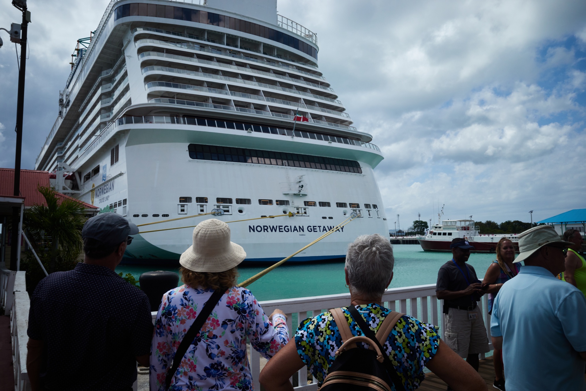 在安提瓜,挪威邮轮公司挪威逃逸号邮轮附近的游客。摄影师:Bing Guan/Bloomberg